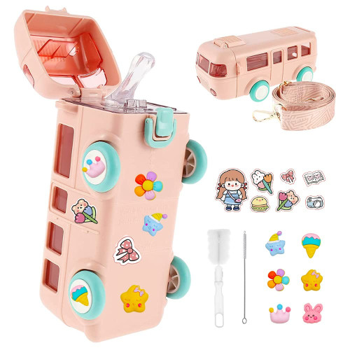 Bus Water Bottle for Kids-16oz Detachable Bus Straw Water Cup with Shoulder Strap Leak-Proof Kids Drink Cup Cartoon Water Jug Toy with Wheels Toddler Water Bottle
