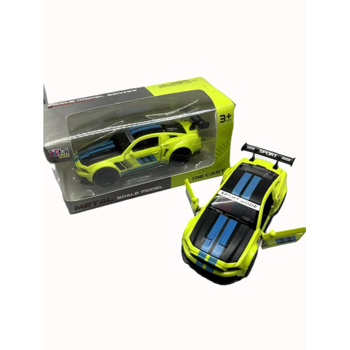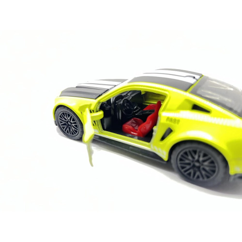 CuteCart Metal Die Cast Sports Car Model, 1:32 Scale, Pull Back Action, Minicher Mustang with Opening Doors, Neon Yellow with Blue Stripes